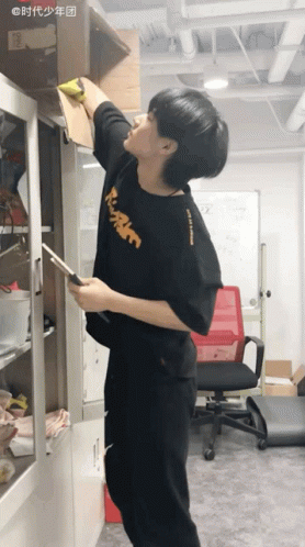 A TNT member, possibly Chengxin or Zhenyuan, has a box fall on his head while reaching for items on a high shelf.