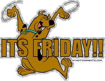 Scooby-Doo joyfully celebrates the arrival of Friday, arms raised in excitement.