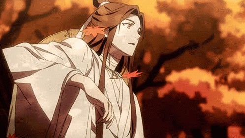 Xie Lian from Heaven Official's Blessing shows concern and worry amidst vibrant autumn trees.