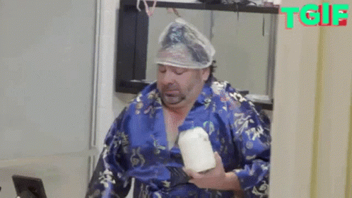 Big Ed from 90 Day Fiance applies mayonnaise to his hair while wearing a shower cap and blue robe.