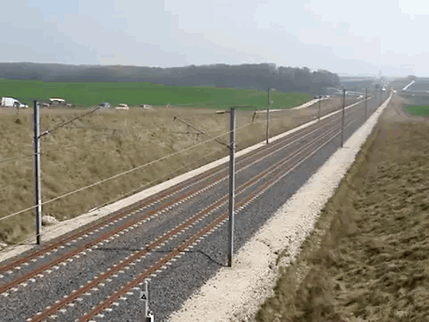 A TGV POS high-speed train speeds through a rural landscape, showcasing its world record capabilities.