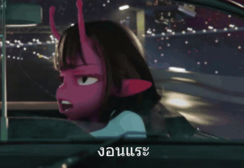 A cute pink alien-like animated character with antennae sulks in a car at night, with city lights in the background.