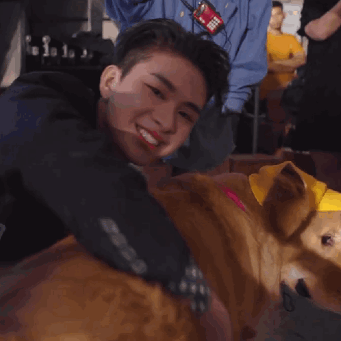 Thaichayanon smiles while affectionately hugging a golden retriever wearing a yellow hat.