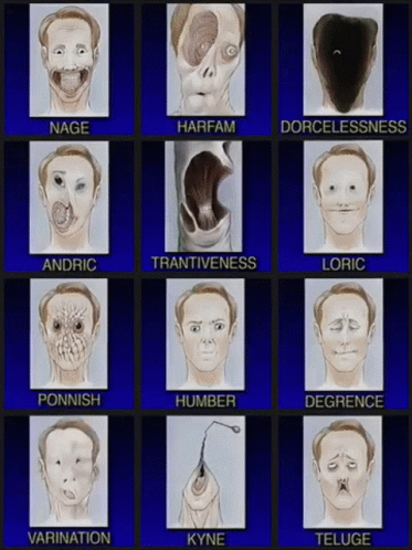 A disturbing collage of distorted faces from the Thalasin Blue Channel, featuring expressions like Nage, Harfam, and Andric.