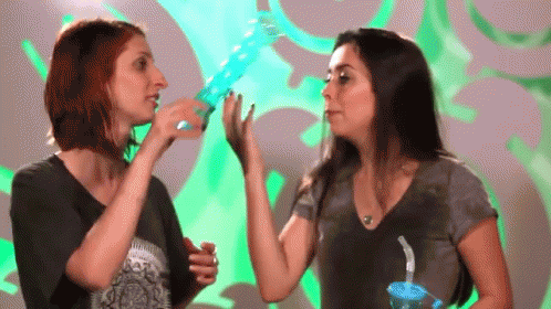 Thalita pours water from a bottle onto Gabie's head, soaking her in a playful moment.