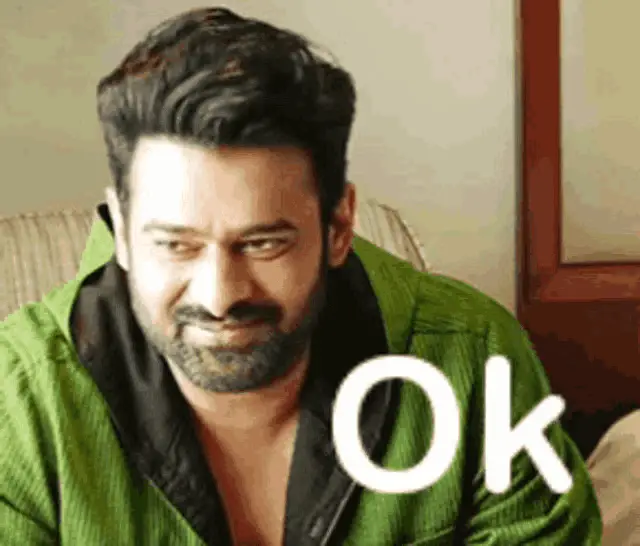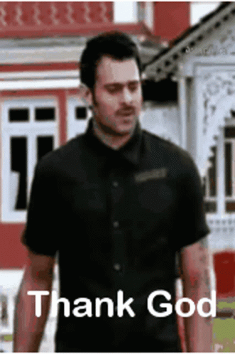 Prabhas expresses relief with an irritated look, saying 'Thank God' while wearing a black shirt.