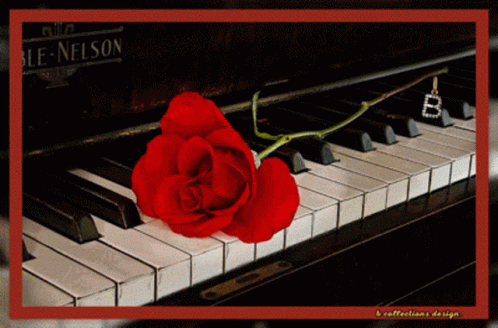A beautiful red rose rests on the white and black keys of an old piano, with a 'Thank you' message.