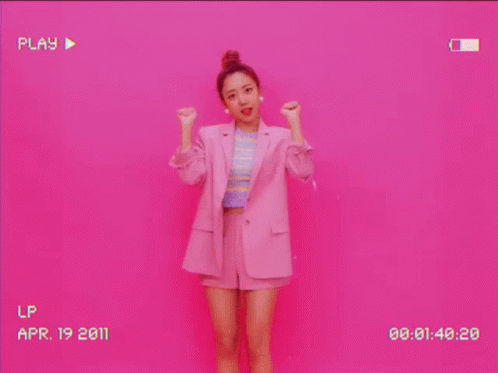 Apink's Kim Namjoo dances energetically in a vibrant pink suit against a matching pink background.