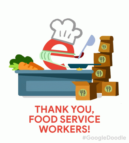 A Google Doodle thanking food service workers, featuring a chef character and food delivery boxes.
