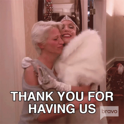 Dorinda Medley and Luann De Lesseps hug, expressing gratitude with 'Thank You For Having Us' from Real Housewives of New York.