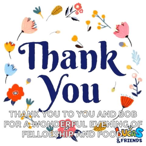 A heartfelt thank you message with flowers, expressing gratitude to Bob for a wonderful evening of fellowship and food, from Lucas & Friends.