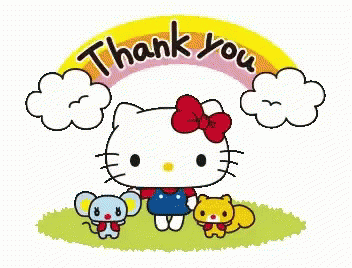 Hello Kitty and friends stand on grass under a rainbow displaying a 'Thank you' message.