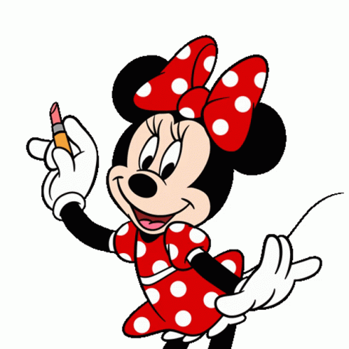 Minnie Mouse, in her iconic red polka dot dress, holds a lipstick and expresses gratitude with 'Thank you!' text.