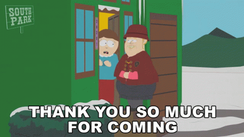 Liane Cartman from South Park expresses gratitude, saying 'Thank You So Much For Coming'.