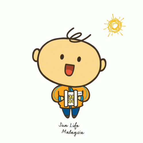 Cute Sun Life Malaysia cartoon character expresses gratitude, holding a 'Thank you' sign with a cheerful sun icon.