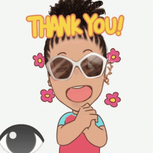A cartoon girl with sunglasses and flowers in her hair expresses gratitude, saying 'Thank You!'