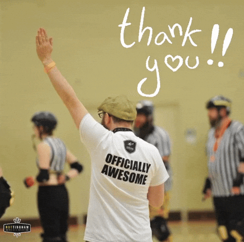 Roller derby official in an 'Officially Awesome' shirt raises an arm in thanks, surrounded by players.