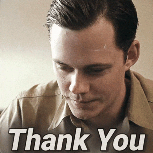 Bill Skarsgård looks up, then offers a shy and grateful smile with a 'Thank You' message overlaid.