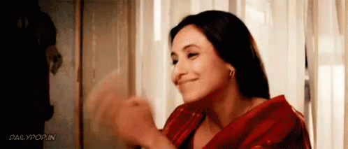 Rani, wearing a red saree, smiles warmly and claps her hands, expressing gratitude with a 'Thank You'.