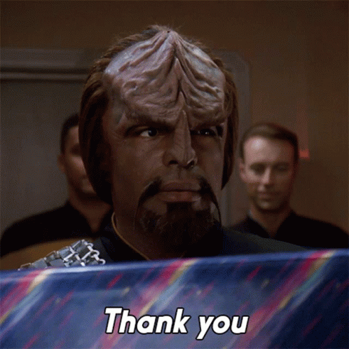 Worf, the iconic Klingon character from Star Trek, delivers a stern 'Thank you' with a text overlay.
