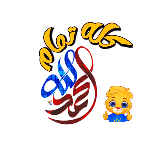 A cheerful cartoon lion gives a thumbs up next to Arabic calligraphy reading 'Thanks God' and 'Everything is fine'.