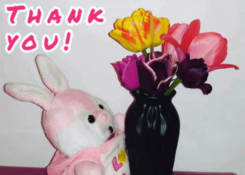 A cute pink bunny plushie next to a vase of vibrant tulips, expressing a heartfelt thank you message.