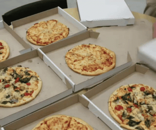 Multiple delicious pizzas in cardboard boxes, ready to be enjoyed on a table.
