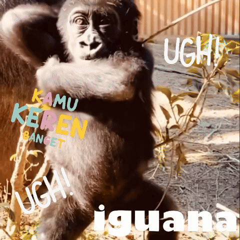 A baby gorilla makes expressive faces with 'UGH!' and 'KAMU KEREN BANGET' (You are so cool) text, plus 'iguana'.