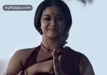 Keerthy Suresh smiles warmly, expressing thanks with a gentle gesture in traditional attire.