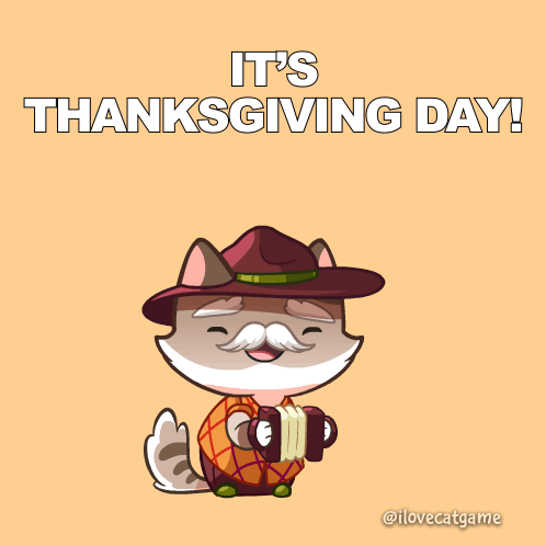 A charming animated cat in a pilgrim hat plays an accordion, celebrating Thanksgiving Day with cheerful music.