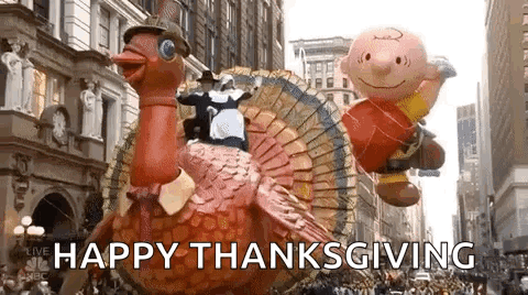 A festive scene from the Macy's Thanksgiving Day Parade featuring a turkey float with pilgrims and a Charlie Brown balloon.