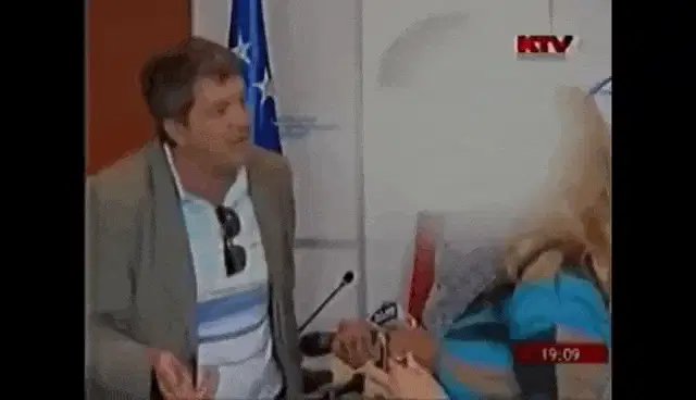 A woman is interviewed with a microphone, with a '2009' sign visible. Context relates to Thaqi Hashim, Albin Kurti, and Kosovo politics.