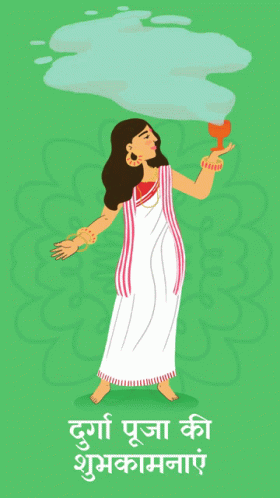 An illustration celebrating Durga Puja, featuring a woman in traditional attire with festive smoke and wishes.
