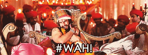Ranveer Singh in a vibrant scene from 'Tharki', making expressive gestures with the hashtag #WAH!
