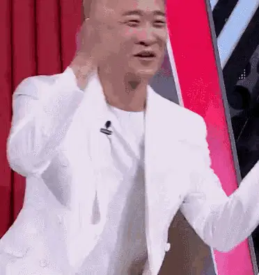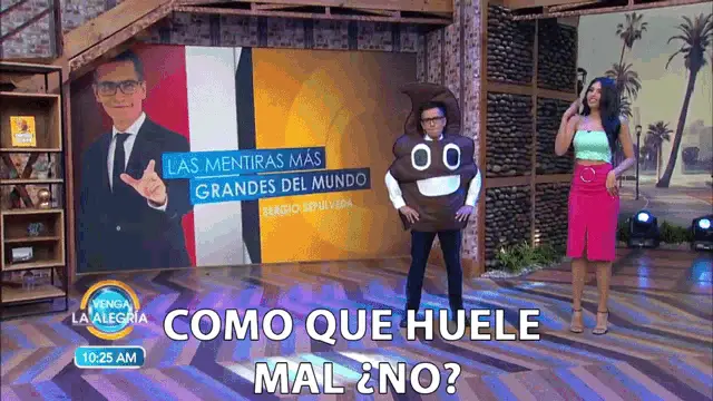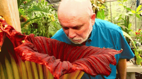 Bald man with a beard reacts strongly to the awful smell emanating from a large, red, stinky flower.