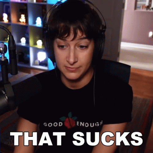 Alli Speed, wearing headphones and a 'Good Enough' t-shirt, reacts with visible text 'That Sucks'.