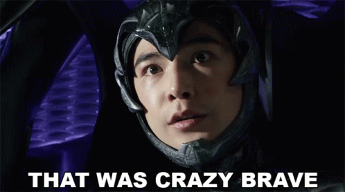 Zack Taylor, portrayed by Ludi Lin, reacts with a surprised expression, uttering 'That Was Crazy Brave'.