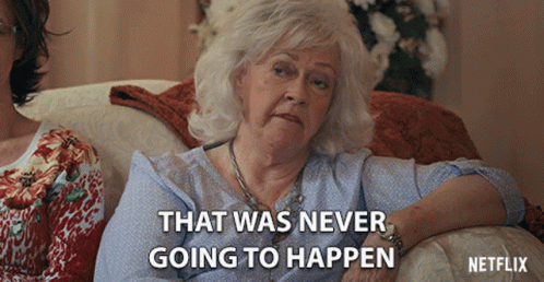 An older woman on a couch states, 'That Was Never Going To Happen,' expressing disbelief or certainty.