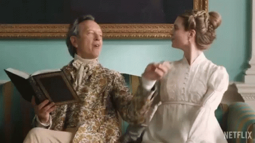 Richard E. Grant in a scene from Netflix's Persuasion, discussing with a woman on a couch.