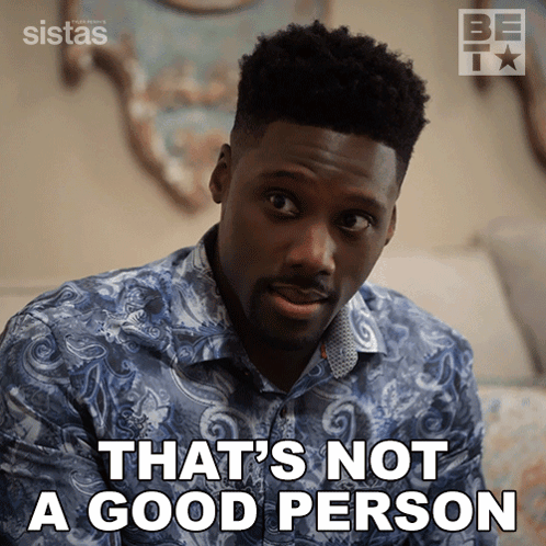 Bayo, played by Ellis E. Fowler, expresses his disapproval, stating 'That's not a good person' while wearing a blue patterned shirt.