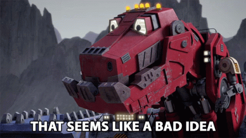 Ty Rux, the red robot dinosaur from Dinotrux, expresses concern with the phrase 'That seems like a bad idea.'