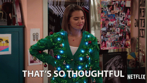 Paris Berelc, as Alexa Mendoza, wearing a festive Christmas sweater, says 'That's so thoughtful'.