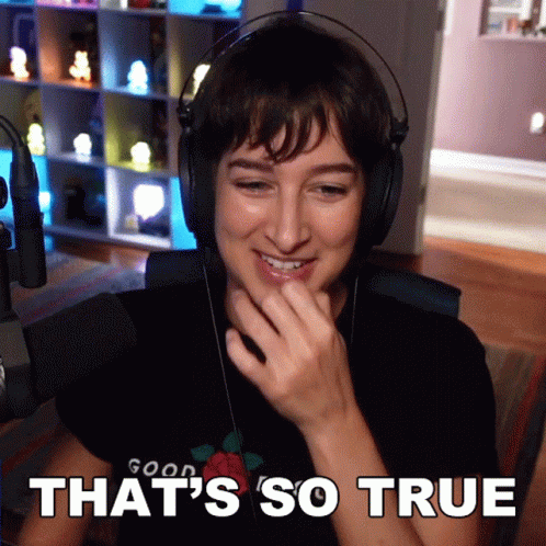 Alli Speed smiles and laughs, reacting with 'That's So True' while wearing headphones.