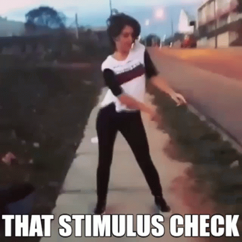 A person dances energetically on a sidewalk, celebrating a stimulus check.