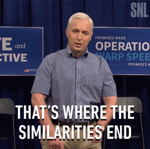 Beck Bennett as Mike Pence delivers a line from an SNL skit, with the text "THAT'S WHERE THE SIMILARITIES END" on screen.