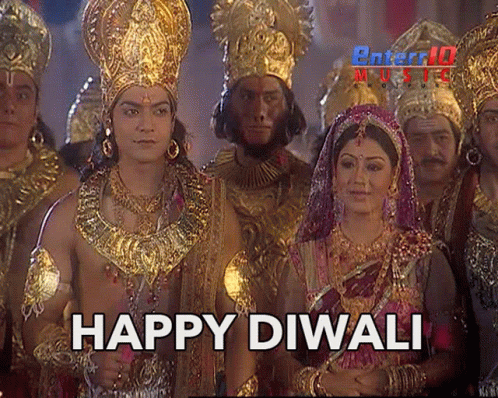 Happy Diwali wishes with characters from Hindu mythology, adorned in traditional attire and gold jewelry.