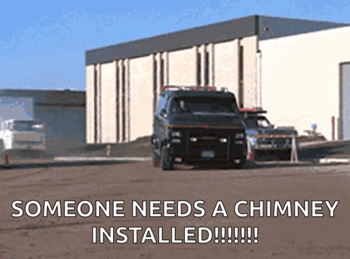 The iconic A Team van performs a dramatic skid, kicking up dust, with a humorous caption overlaid.
