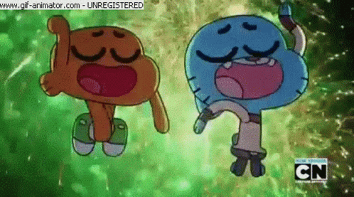 Gumball and Darwin from The Amazing World of Gumball joyfully dancing against a vibrant, changing background.