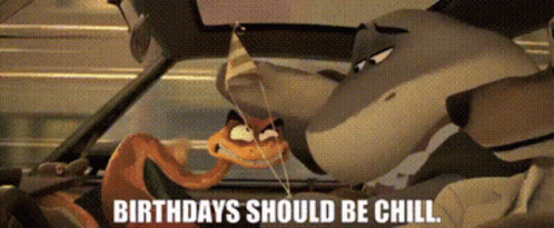 Mr. Shark from The Bad Guys with a party hat, alongside Lou the snake, stating 'Birthdays Should Be Chill'.