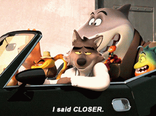 Mr Wolf from The Bad Guys movie intensely demands 'I said CLOSER' while driving with his crew.